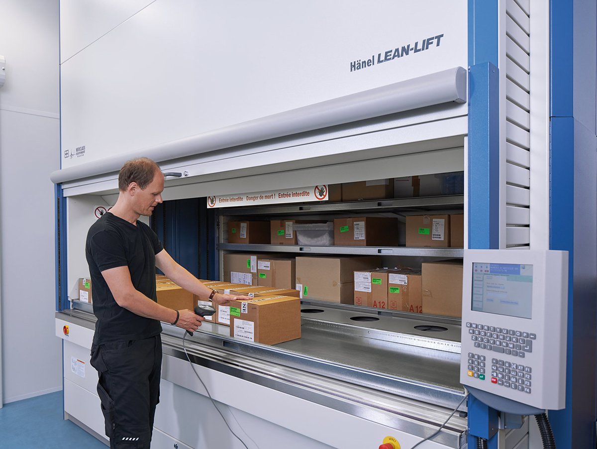 El Hänel Lean-Lift es un armario vertical automático que almacena cajas de plástico y/o cartón en columnas verticales y utiliza un extractor central para entregar la bandeja solicitada al operador en el punto de acceso. Su principal característica es la optimización automática de la altura de almacenamiento, ajustando cada estante a la altura real de las piezas almacenadas. Este principio permite una alta densidad de almacenamiento y un aprovechamiento muy eficiente de la altura del edificio.